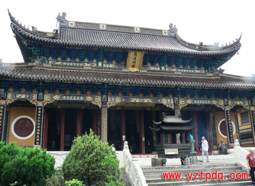 從山門進入寺院,首先映人眼簾的是前殿。大雄寶殿的正中是釋迦牟尼裝金佛像,佛體神圣莊嚴,神態慈祥端莊,仿佛正時時處處關切著所有向他膜拜的人們。佛龕呈六角狀,六根木雕龍柱工藝精湛,佛龕的頂部站立著伸展巨翅的靈鷲。www.chinazsb.com靈鷲山俗稱靈山,因山上多靈鷲而得名。傳說釋迦牟尼當年就在靈山傳經布道。大雄寶殿兩側沒有像一般寺院那樣矗立十八尊羅漢法身塑像,而是供奉竹禪大師題跋書畫十八尊羅漢像的浙江天童寺“照畫石刻’’拓片。照畫石刻拓片十八尊羅漢像,具有很高的藝術價值,在當今漢傳佛教中十分罕見。