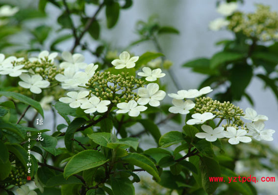 瓊花屬忍冬科莢屬,是一種落葉或半常綠灌木,高可達數米。瓊花的枝條多呈灰黑色,幼枝、芽、葉柄均有灰白色或黃白色的垢屑狀星狀毛。葉對生,卵形、橢圓形、或卵狀長圓形,長5厘米~11厘米不等,邊緣有細齒,表面疏生星狀柔毛,背面密生星狀柔毛。每年4月中下旬開花,5月上中旬終花。花為大型聚傘花序,由大型不孕花和兩性小花兩部分構成。大型不孕花多為8朵,分布于花序周圍,也偶有7朵、9朵、10朵甚或更多者,每朵花冠直徑約3.2厘米~4.5厘米,最大可達7厘米,每朵5瓣,初開芽綠色,漸轉黃白色,盛開全白色;另一部分為花序中間簇生的數10朵乃至近百朵兩性小花朵,花冠輪狀,白色,直徑僅7毫米~10毫米,亦分5瓣,有雄蕊5枚,黃色,雌蕊一枚,子房下位。兩性小花有奇香。大型不孕花比兩性小花早開7天左右,凋落亦比兩性小花早。如遇秋季氣溫回升或暖冬天氣,可二度開花。瓊花果實由兩性小花受粉后形成,初時青綠,繼而米黃,再轉暗紅,最后紫黑,百果成簇,每粒長約10毫米~12毫米,寬約7毫米~8.8毫米,呈扁平、橢圓形。