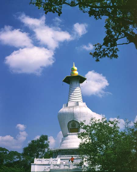 揚州的白塔高 27.5 米 ,下面是束腰須彌塔座,八面四角,每面三龕,龕內雕刻著十二生肖像。和北海白塔的厚重穩(wěn)健不同,揚州白塔比例勻稱,玉立亭亭。和身邊的五亭橋相映成趣。