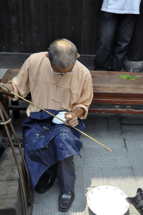 日常使用陶瓷器很普及,因此各地都能看到補碗匠,他們一般沒有固定的攤位,挑一副簡易擔子,內存必要的工具和材料,走街穿巷攬生意做,從那“補碗哦,補碗哦……”吆喝的長腔中,你能發覺他們不是本地人。操此營生的,以江西老表居多,景德鎮是我國著名的瓷都,產量豐富,由此衍生出“補碗”行業也是很自然的事情。有一句歇后語:江西人補碗——自顧自,即是從補碗鉆孔時發出的“口茲口茲”有節奏的聲響引發的,它似乎沒有譏諷老表的意思,而是抨擊自私自利的行為。隨著補碗行當的消亡,這句歇后語也已淡出江湖。補碗匠大多身懷絕技,小到酒杯,大到幾個人合抱不過來的醬缸,他們都有本領使之“完璧”。有些人家,祖傳的珍貴瓷器有了裂紋,未雨綢繆,預先給“補”起來;而尋常人家,生活節儉,只要“補”比買新的便宜,一只破碗他們都不舍得丟棄,湊合著補一補再用。當然,如今可不這樣了,瓷器磕破了,一扔了之,誰也不會想到去“補”。