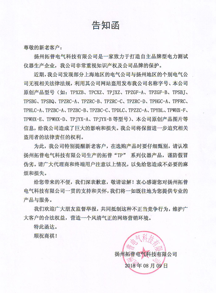 為此,我公司特別提醒新老客戶,在選購產(chǎn)品時要仔細甄別,請認準揚州拓普電氣科技有限公司生產(chǎn)的拓普“TP” 系列儀器產(chǎn)品,謹防假冒偽劣。請廣大代理商和終端用戶注意以上情況,以免給您造成不必要的麻煩和損失。